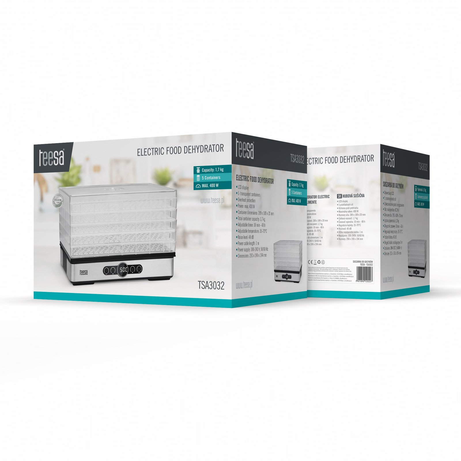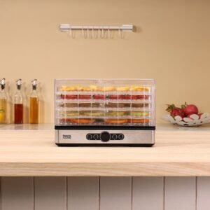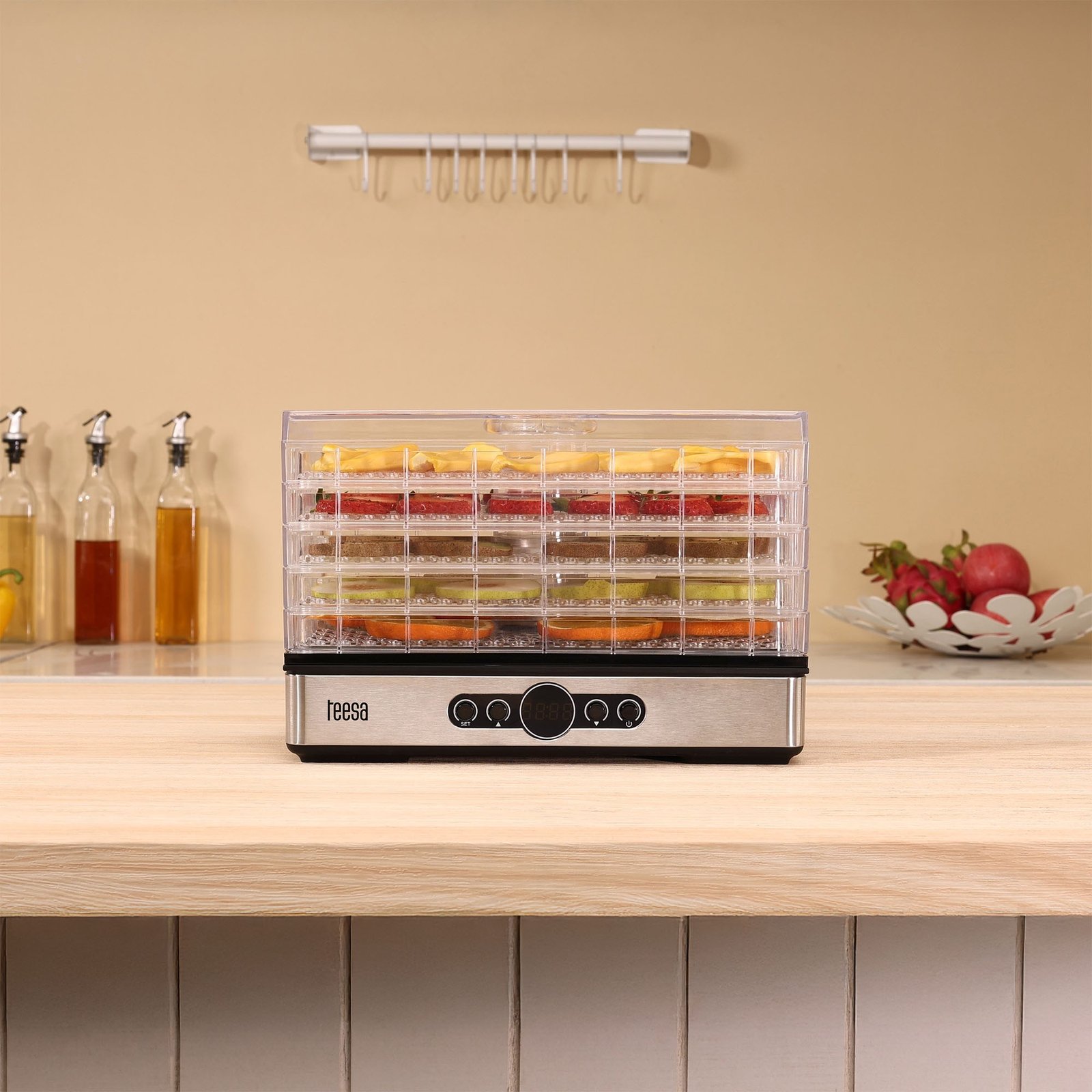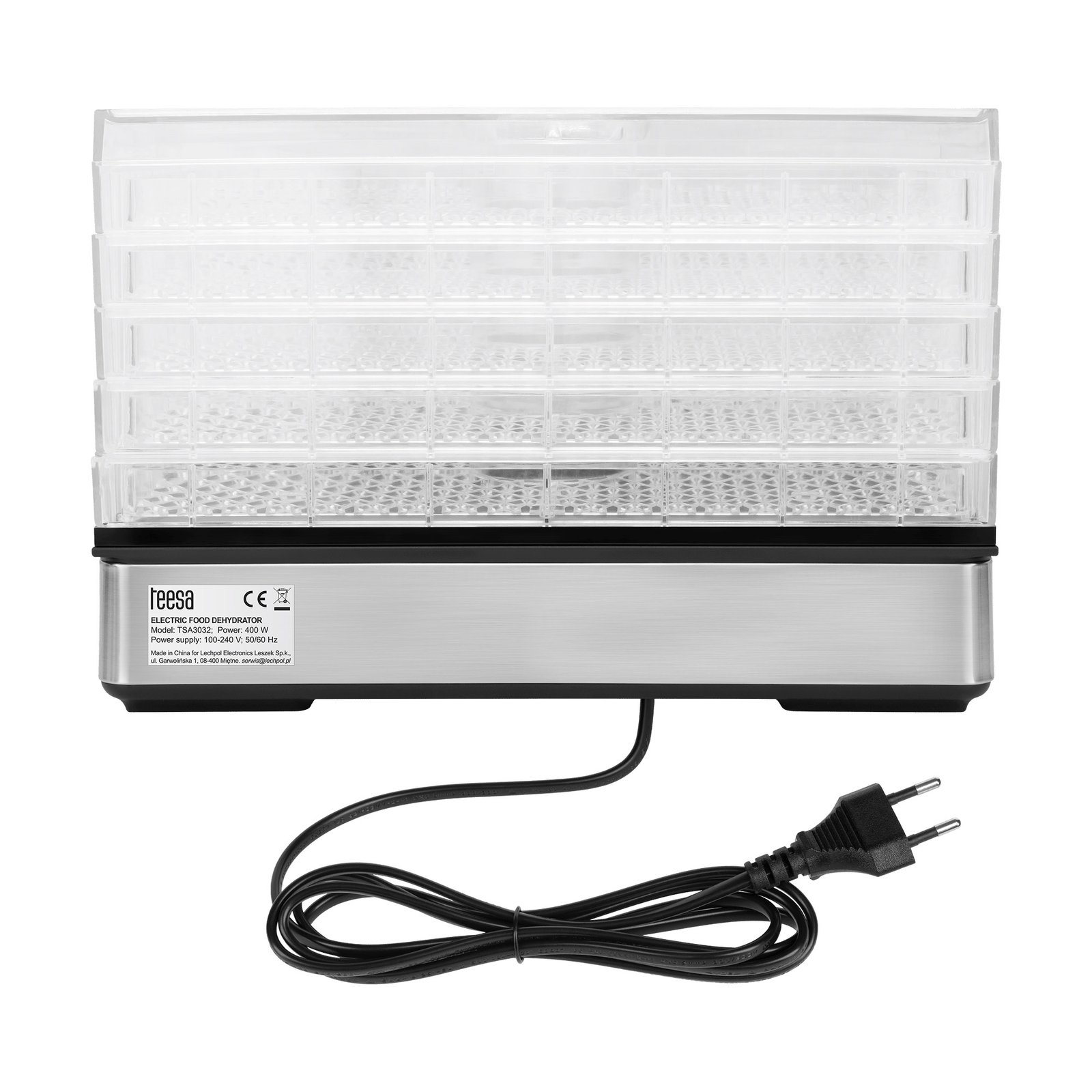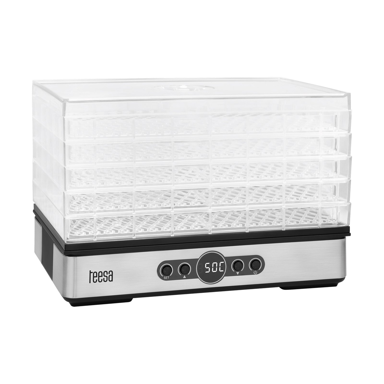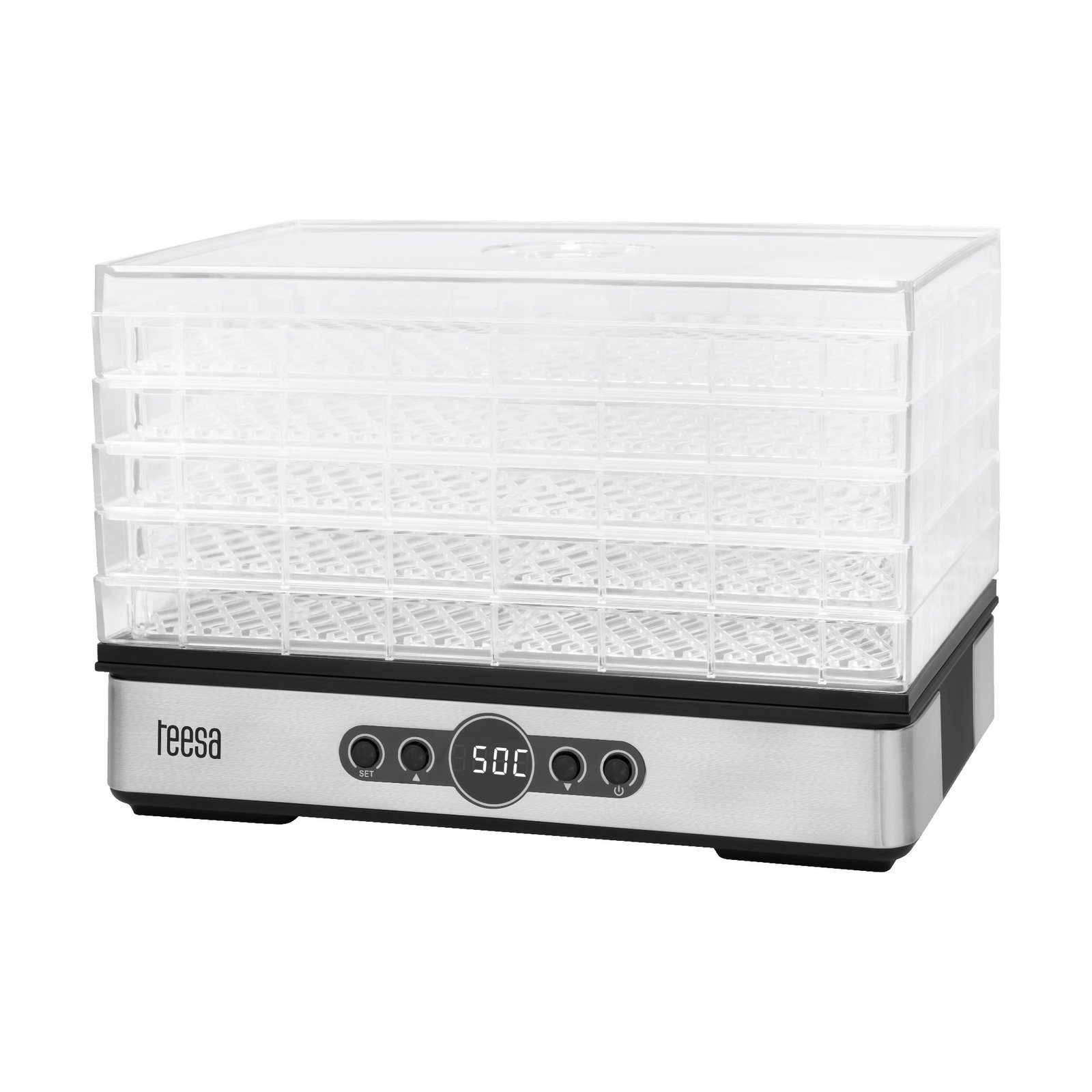 Ο αποξηραντής Teesa διαθέτει 5 μεγάλα, διαφανή κόσκινα, τα οποία μπορούν να χωρέσουν συνολικά έως 1,7 kg προϊόντων. Οι διαφανή δίσκοι επιτρέπουν τον έλεγχο της ξήρανσης χωρίς να χρειάζεται να ανοίξετε τη συσκευή, εξασφαλίζοντας σταθερή θερμοκρασία και αποτελεσματικότητα.